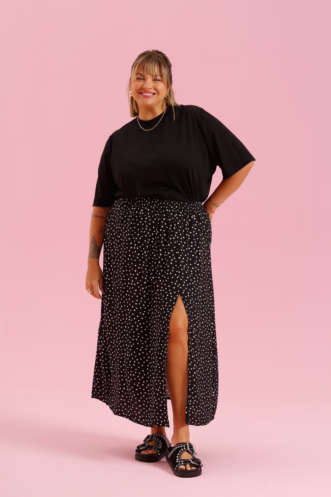 Essa saia é feita em 100% viscose, um tecido leve, fresco e com caimento incrível. Ela possui elástico na cintura, além de uma fenda lateral.
